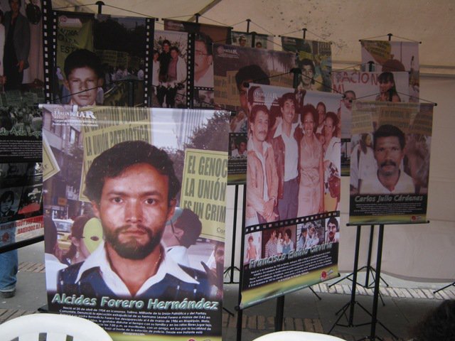 Uno a uno los familiares denunciaban en la tarima instalada frente al capitolio nacional los casos de desaparición forzada de sus hijos(as), esposos (as), hermanos(as). Exhibían pancartas y pendones. Las organizaciones y comités defensores de los derechos humanos presentaban videos, repartían volantes y plegables y dictaban charlas y conferencias en casetas alrededor de la plaza histórica de Bogotá. Varios grupos juveniles y bandas musicales hicieron sus presentaciones sumándose a la jornada por los derechos de las victimas del terrorismo oficial.