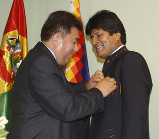 Morales unió » a todo el territorio boliviano con la práctica de fútbol», afirmó el titular del fútbol de La Paz que explicó la razón que sustenció la decisión de imponer la Medalla al Mérito al jefe de Estado, la reversión, «en base de la diplomacia de los pueblos», del veto que se cernía, principalmente sobre la celebración de encuentros internacionales de fútbol en La Paz.