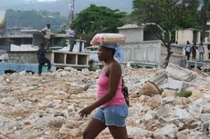 Ni siquiera los cementerios se escaparon la furia de Pacha Mama el 12 de enero. Solo unas cuatro cuadras de la sede de la CTH, Confederación de Trabajadores de Haití un buldózer esta acabando con las tumbas de nichos, fosas y mausoleos por que la Pacha Mama no hace diferencia entre ricos y pobres cuando arremete contra ellos que destruyen la base por la supervivencia de la Madre Tierra.