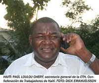 Paúl Loulou Cherý es secretario general de CTH. Cuando nos sentamos para conversar esa tarde en abril me cuenta que nació en el sur de Haití. Comenzó su trabajo sindical el 1986 después que el pueblo había derrocado la dictadura de Jean Duvalier. Uno grupo de lideres sindicales regresó del exilio y comenzó la reorganización de la CTH que había sido fundada 1959. El sindicato sufría una crisis interna que transcurrió durante cinco años hasta que fue superada y Paúl Loulou Cherý fue elegido a secretario general. Cuenta con once federaciones nacionales y un total de 110.000 afiliados.