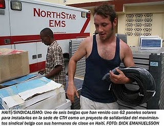 – No ha sido fácil de reconstruir y consolidar el trabajo sindical en Haití, dice. Hemos recibido un gran apoyo internacional, de la CSI, de diferentes organizaciones sindicales en el mundo, dice el líder sindical y hace un gesto a un grupo de seis belgas. Han llegado para armar y montar 62 paneles solares para que no nos quedáramos sin energía por los cortes entre 06.00-22.00 horas. El proyecto belga cuesta aproximadamente 25.000 euros.