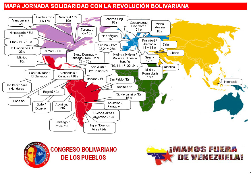 MFV así como el CBP y otros grupos progresistas, hacen un llamado a las naciones del mundo a sumarse a la «Jornada de Solidaridad Internacional con Venezuela» con la intención de combatir las mentiras y desinformación que los medios de comunicación crean para contrarrestar los logros del movimiento revolucionario venezolano.