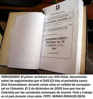 ¿Sabes, Renato, en que operación me incluyeron a mi? Pues se llamaba “Canela”. Lograron documentarme en 450 folios. Si, fíjate, 450 paginas grandes, llenas de documentación sobre este reportero, mis correos electrónicos, transcripciones enteras de comentarios en Caracol Radio, reportajes, llamadas telefónicas, las rutas de mi traslado en el país y todos los viajes, desde el 2001 hasta 2005 al exterior, fechas y lugares exactos.