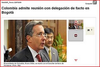 Uribe esta respondiendo a la visita que le hizo la delegación del Dictador Micheletti en Bogota a final del mes de julio 2009. Primero se había encontrado con Oscar Arias, el “Hombre de Hillary”, presidente progringo de Costa Rica, y la delegación del derrocado presidente Manuel Zelaya. Pero la delegación de Micheletti, te recuerdas Renato, no regresó a Tegucigalpa, por que cuando terminaron las conversaciones en Costa Rica, volaron al sur. Primero a Panamá, donde fueron recibidos por el presidente de la misma calaña como Uribe y después a Bogota. Ahí fueron invitados a la Casa Presidencial. De vuelta a Honduras los golpistas estaban por reventarse de impaciencia para contar en público y en los medios, como el tuyo, de su visita en el Palacio de Nariño. Decía que Uribe tenía mucha simpatía por el régimen golpista del Dictador Micheletti. Puso a Uribe en aprieto internacional por que éste no quería que la visita golpista, tan cerca la muerte y fuego en Honduras, fuera pública. Pero tuvo que admitir que si, mientras el mundo veía con horror el golpe militar en Honduras y sus secuelas, el señor Uribe recibió los enviados del Dictador. Pero así es Uribe. Votó contra los golpistas en la OEA, la ONU y UNASUR, pero en privado juró amor eterno a su compinche político en Tegucigalpa.