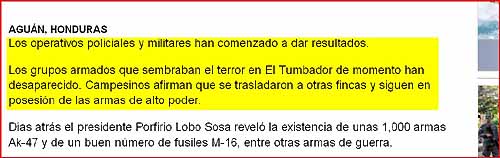 Bajo el cínico titulo: “Los operativos policiales y militares han comenzado a dar resultados”, resultados que el pueblo hondureño hasta ahora no ha visto, ni un solo detenido y menos un solo AKA-47 de los mil (1000) que el presidente de facto y su ministro de seguridad aseguran se encuentran allá entre los campesinos entrenados por viejos comandantes guerrilleros sandinistas en el país vecino.