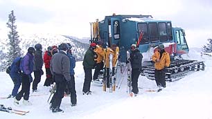 So-called ‘cat skiers,’ like this group in Colorado, are taken to otherwise inaccessible fresh snow on treaded vehicles called snowcats. (Michael Socher)