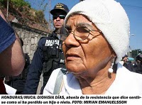 Y se siente como las Madres o Abuelas de Plaza de Mayo en Buenos Aires que ha venido a Honduras en calidad de integrante de la Comisión de Verdad-Verdad (no la oficial) para revisar y registrar las violaciones de los derechos humanos después el Golpe de Estado. Y la Abuela Dionisia se siente hoy como una de ellas, por que un hijo, un nieto ha desaparecido. Por el momento. Y por eso esta ella también en la calle, como las Madres y Abuelas en Buenos Aires en esos días grises y peligrosos en 1977. Fue cuando comenzaron su lenta caminata en la Plaza de Mayo que les causaron tanto horror a aquellas señoras que sacudieron a los generales y los corruptos presidentes de “Borrón y Cuentas Nuevas” como, por ejemplo, Carlos Menem, que les dio una amnistía “Punto Final” a Videla&Cia. Pero ya están detrás de las rejas para el resto de sus vidas, según la sentencia la semana pasada contra uno de esos el golpistas, Jorge Videla.
