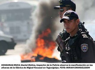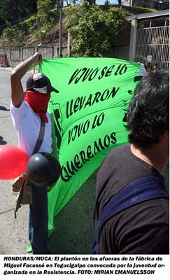 – Miguel Facussé se cree dueño de este país. Aquí hemos tomado las calles en las afueras de la fabrica de Facussé y se va a reunir el Comité Ejecutivo del Frente para tomar otras acciones. El Frente acusa directamente al señor Facussé por el secuestro de Juan, dice la luchadora popular, bronceada y trigueña después de haber ido meses en las calles combatiendo primero el golpe de estado militar y ahora construyendo también una defensa organizada al pueblo hondureño para rechazar las alzas de la vida en el post-golpe. El país esta destrozado económicamente y se refleja en los 16 asesinatos diariamente.