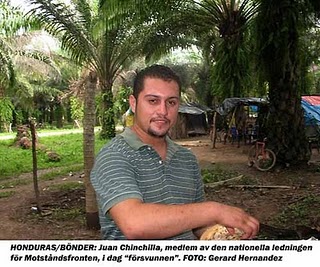 En el Bajo Aguan con sus asentamientos de familias campesinas sin techo, sin agua potable, sin tierra y sin lo más básico para la supervivencia humana existe la permanente amenaza de ser despertados a las 5.30 de la mañana de los uniformados por ser desalojados de sus tierras. Son además tildados por los medios ligados al golpe de estado de ser “guerrilleros”, de poseer de “mil AKA-47”. En esas tierras, la inmensa mayoría de los campesinos son de edades menores de 30 años por lo cual el trabajo político-organizativo de Juan Chinchilla ha sido muy valorado e importante.