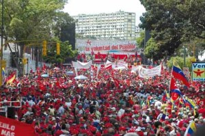 Desde cinco puntos de la ciudad, una multitud se movilizó hasta las afueras del palacio de Miraflores para asistir al encuentro donde el Presidente de la República, Hugo Chávez Frías, afirmó que la última “dictadura” fue la impuesta por los gobiernos que se aliaron en el Pacto de Puntofijo, tras la caída del régimen militar.