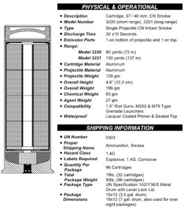 Efectivamente, estas granadas provienen de Combined Tactical Systems, en Jamestown, Pennsylvania. Su gas se compone de un 71% de combustible por un lado, que consta de clorato de potasio, carbonato de magnesio, nitrocelulosa y sacarosa.