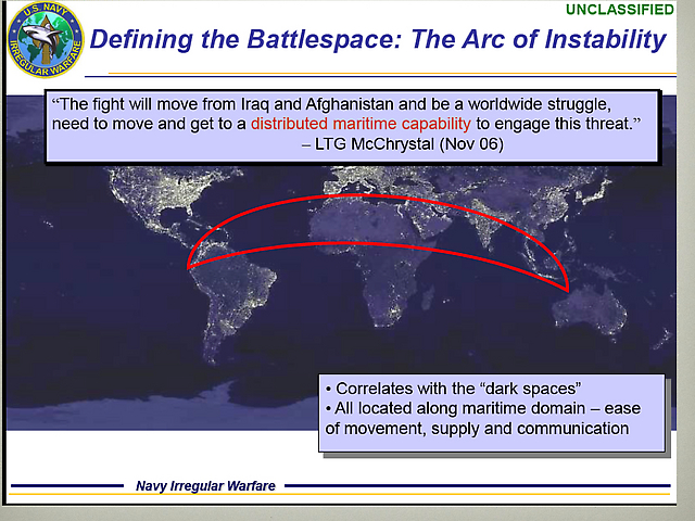 Un documento titulado la “Doctrina de Guerra Irregular de la Armada de Estados Unidos”, publicado en 2009, revela los planes expansionistas de Washington en el mundo. Dentro del documento, fue incluido un mapa que supuestamente define el nuevo “campo de batalla” de Estados Unidos a nivel mundial. El mapa destaca un “arco de la inestabilidad”, dentro de lo cual se encuentran los blancos de esta “batalla”, que incluyen la gran mayoría de países desde Asia Central, el Medio Oriente, el Norte de Africa y Venezuela.