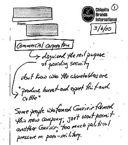 Uno de los documentos obtenidos demuestra pagos a fuerzas paramilitares derechistas con sede en Santa Marta por parte de Chiquita por servicios de seguridad, incluyendo inteligencia sobre operaciones de grupos guerrilleros después de que las AUC tomaron el control de la región a mediados de los 90.