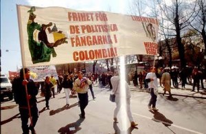 IRONÍA DE LA VIDA: Joaquín Pérez, a la izquierda, llevando la pancarta en una manifestación en Suecia exigiendo LIBERTAD A LOS PRESOS POLITICOS EN COLOMBIA, durante la campaña por la presa politica más vieja en ese momento, Mercedes Úsuga, militante comunista de 67 años que fue presa durante el montaje de la “Justicia Militar Sin Rostro” en la región bananera de Urabá, acusándola de ser autor intelectual de una masacre. Fue puesto en libertad por falta de méritos. Lo que el Terrorismo de Estado no logró asesinar en Urabá, controlado por la UP y el PCC en donde fueron asesinados 1000 militantes del PCC y UP durante la década ´90, fueron “neutralizados” por el Poder Judicial. Hoy, es la Justicia del DAS-G3 que va a procesar a Joaquín Pérez. FOTO: D.E.
