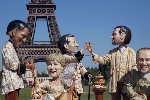 Los hombres vestidos con jubón de seda sobre pechera de encaje y la única mujer (Angela Merkel) con vestido largo, collar de perlas de tres vueltas y abanico: ocho cabezudos con las caras de los ocho dirigentes del G8 se instalaron en el Campo de Marte, al pie de la Torre Eiffel.