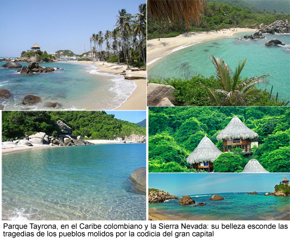 El Parque Tayrona, uno de los ecosistemas más hermosos del planeta, es ofertado a la empresa privada y al turismo por las modificaciones legales de la administración de Uribe y Santos. Las masacres de la herramienta paramilitar se ocuparon de desplazar a miles de habitantes de las tierras codiciadas. Los Jefes paramilitares, como premio por sus “servicios” al gran capital, hacen grandes negocios. Según el jefe paramilitar ‘El Canoso’ la empresa Aviatur del magnate francés que hoy gestiona el Parque Tayrona obtuvo la licitación en asociación con varios jefes paramilitares, entre los cuales alias ‘El Patrón’