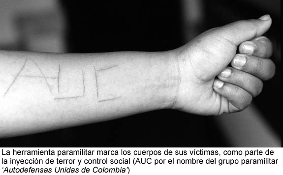 Las violaciones colectivas son un mecanismo de inyección de terror y desplazamiento: “Llegaron los paramilitares, congregaron a todos, pusieron música y empezaron a beber (…) violaron a algunas mujeres, dieron muerte a unas cuantas personas y bailaron. Obligaron a las mujeres a cocinar… violaron a las jovencitas. La fiesta se prolongó cuatro días. Los cadáveres empezaron a pudrirse. Quemaron a algunos de ellos para que no se pudieran identificar. Oímos sobrevolar a un helicóptero pero no pasó nada hasta el cuarto día. Los paramilitares se quitaron los pasamontañas y dijeron que había llegado el ejército. Entonces vinieron automóviles, fiscales y personas de la Cruz Roja. El ejército estaba impidiendo la entrada al poblado mientras se producía la matanza.” (18)