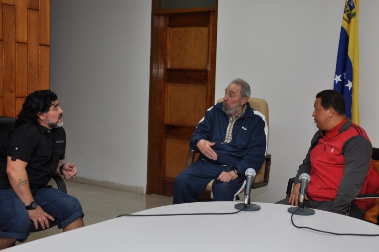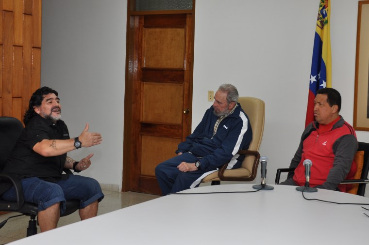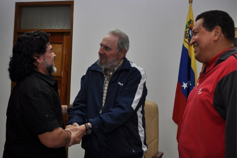 Caracas, AVN .- Chávez y Fidel ya estaban juntos y llegó “El Diego”, Diego Armando Maradona. Tres figuras que suscitan el inmenso amor de sus pueblos, tres fortalezas que han sabido confrontar poderes inmensos sin medir sacrificios y sin doblegarse jamás, reunidos en La Habana para discutir, como equipo, la continuación de la recuperación del Presidente Chávez.