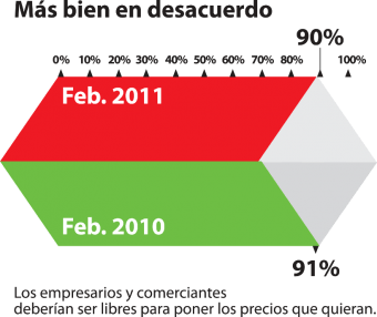 La mayoría de la población es consciente de esto, razón por la cual en los sondeos de percepción que realizamos, apoya sin reservas la regulación del gobierno y le da la espalda a los coros falsos e interesados del “libre mercado”, 89.6% de la población en el 2010 y 92% en 2011, manifiestan estar de acuerdo con que el estado intervenga para garantizar precios bajos en todos los productos de la canasta básica; coherente con esto, el 91% en 2010 y el 90% en 2011 rechaza que los empresarios y comerciantes puedan tener la libertad para poner los precios que quisieran.