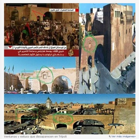 Pero nadie comprobó con detenimiento las imágenes. Algo raro sucedía allí. En efecto y según un medio ruso, Jourdon, las imágenes transmitidas en directo por la cadena Qatarí (país que además de enviar vituallas a los Rebeldes libios, envía tropas de asalto) mostraban un sector edilicio de la Plaza sin la conocida ventana y estuco de la famosa Plaza Verde.