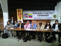Alrededor de 500 representantes de los trabajadores del sector público de Colombia culminan este viernes el encuentro nacional dedicado a los temas mas acuciantes como la estabilidad laboral, la negociación colectiva, reestructuración de los organismos del estado, la situación de provisionalidad en la carrera administrativa, la parte salarial, entre otros aspectos. Durante el dia de ayer los participantes escucharon los informes de los presidentes de las principales federaciones y confederaciones sindicales y ratificaron su negativa a las políticas agenciadas por el ejecutivo nacional que ha generado en el territorio nacional el despido de mas de 20 mil trabajadores e impulsado la intermediación laboral.