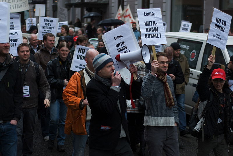 | Protesta en Oslo, Noruega, en abril de 2008 en contra de que la ISO aprobara el formato OOXML como un estándar abierto. Foto: Andy Armstrong, vía Wikipedia. |