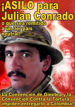 ‘Se apela al respeto por el DIH y por la ética que debe ser fundamento imprescindible del proceso bolivariano en Venezuela. Por respeto por la Convención de Ginebra corresponde que Venezuela le otorgue asilo a Julián Conrado o lo remita a un 3er país neutral. Por respeto por la Convención Contra la Tortura no puede ser entregado a un estado torturador como lo es el régimen colombiano.