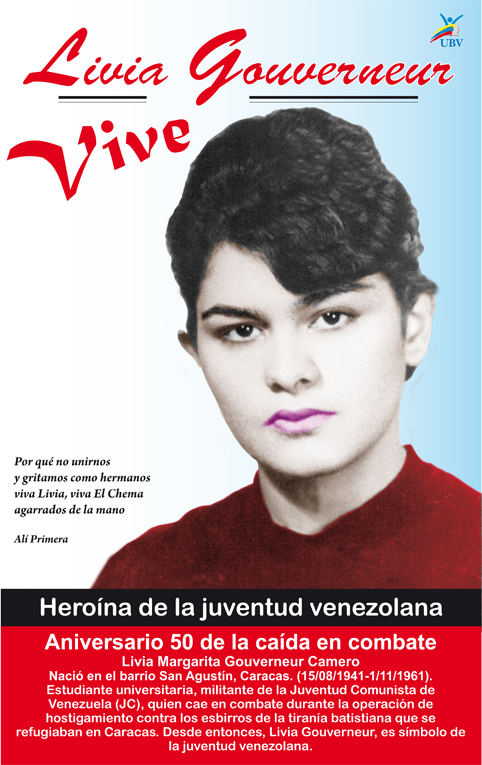 Con motivo de conmemorarse el primero de noviembre del presente año el cincuentenario de la muerte de Livia Gouverneur el Colectivo para la construcción de la memoria de los años 60 y la Universidad Bolivariana de Venezuela, con sede en Los Chaguaramos, están convocando a un conversatorio donde participarán los contemporáneos de dicha líder estudiantil explicando importantes aspectos de la lucha revolucionaria de los años 60 y el papel destacado que jugó esta mujer revolucionaria en dicha contiendaLivia Margarita Gouverneur Camero fue una estudiante universitaria militante de la Juventud Comunista de Venezuela que participó en las luchas populares de comienzos del gobierno adeco de Rómulo Betancourt quien contó con el apoyo del partido COPEI dirigido por Rafael Caldera y la Unión Republicana Democrática (URD) presidido por Jóvito Villalba.