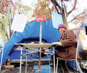 A las 5 de la tarde, los acampados de McPherson Square saben que una vez más -en el mismo barrio donde se puede llegar andando al Banco Mundial- la noche está a punto de echárseles encima. “Esta es mi casa para el año próximo. Los tres muñecos de peluche al lado de la colchoneta representan a mis hijos. Ellos me acompañan mientras espero el nuevo día. No se sale de la mendicidad aunque se quiera”.