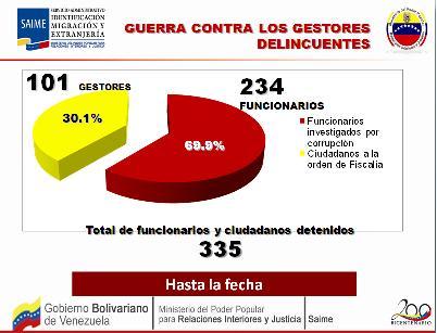 El director general del SAIME, Dante Rivas, aseguró que “de esta manera le seguimos dando un golpe duro a la corrupción a través del plan Guerra Contra los Gestores Delincuentes; ya no es necesario que acudan a estos bandidos, ahora es más fácil realizar los trámites que el SAIME ofrece a los usuarios y usuarias, pero de ser objeto de este tipo de hechos pueden realizar su denuncia por medio de nuestros canales de comunicación como lo es Twitter @DanteRivasQ, el correo directorgeneral@saime.gob.ve, la página web www.saime.gob.ve, un mensaje de texto al 0426-5107726 o una simple llamada gratuita al 0800-SAIME-00 (0800-72463-00)”./Prensa SAIME