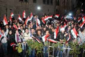 Una enorme multitud de personas colmó esta noche la Plaza Al-Mohafazat en esta capital en apoyo al gobierno del presidente Bashar al-Assad y de rechazo a la violencia terrorista, alentada y organizada en el extranjero.