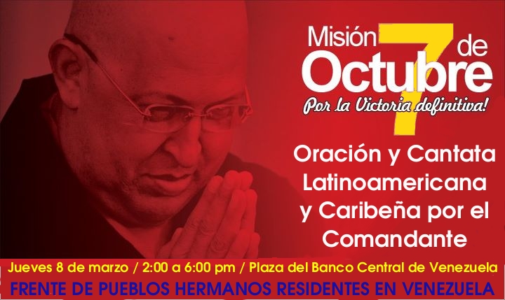Las comunidades latinoamericanas y caribeñas residentes en Venezuela, nos hemos convertido en un porcentaje importante de la población Venezolana, miles de inmigrantes, por diversas razones: económicas, políticas o cualquier otro motivo hemos tomado la tierra de Bolívar como nuestra , desarrollando nuestro proyecto de vida y familiar, es así que no somos ajenos al devenir político que se vive en nuestro país y continente.por lo anteriormente expuesto hemos decidido realizar una jornada de solidaridad y apoyo al comandante presidente: Hugo Chavez , esta actividad se llevarà a cabo el dia 8 de marzo desde las 2 de la tarde en la plaza del banco central de venezuela, en ella participaran Los sacerdotes Pablo Urquiaga, Numa Molina y Luis Zabala, quienes encabezaran la actividad ecumenica, por otro lado en la actividad cultural estaran grupos del Perù, Ecuador, Bolivia,Colombia (Jeco y su grupo) y Venezuela .