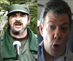 Izquierda; Timochenco, comandante de las FARC, Derecha Santos presidente de Colombia.