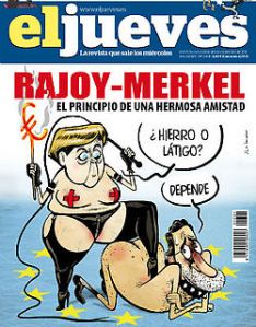 La revista El Jueves denunció hoy que la red social Facebook censuró una portada en la que aparecían Ángela Merkel y Mariano Rajoy practicando sado. «Ayer Facebook eliminó la imagen y comunicó al administrador que la había subido que se le sancionaba con 30 días sin poder subir contenido», explican desde El Jueves.La portada de la publicación era de noviembre del año pasado. Sin embargo, El Jueves vio que funcionaba perfectamente tras el reciente rescate bancario de la UE a España, así que la volvió a subir a Facebook.La viñeta muestra a una Merkel vestida con ropa interior de cuero que da a elegir a Rajoy entre «hierro o látigo», a lo que el presidente del Gobierno responde: «Depende». «Lo curioso del caso es que cuando colgamos la misma portada en Facebook en noviembre de 2011 no sucedió absolutamente nada», aseguran.