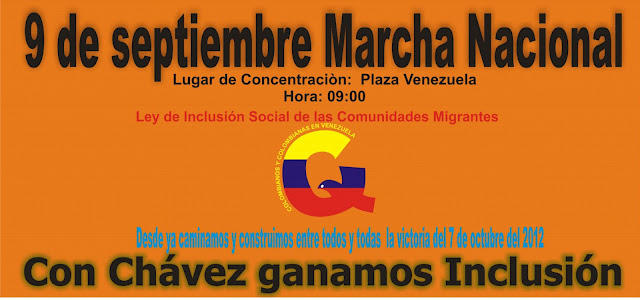 Afianzando los caminos que conducirán al fortalecimiento de Nuestra Segunda Independencia, la comunidad migrante que vive en el territorio venezolano en cabeza de la Asociación de Colombianos en Venezuela convoca a la Marcha Nacional el próximo 09 de Septiembre en Caracas partiendo desde plaza Venezuela a las 09:00 a.m. llegando a la puerta sur de la Asamblea Nacional y finalizando en la plaza el Venezolano donde culminaremos con una jornada cultural, folklórica, musical y gastronomica!