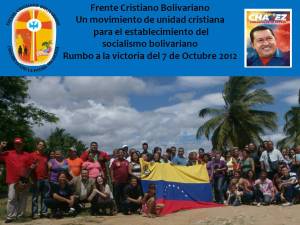 EL FRENTE NACIONAL CRISTIANO BOLIVARIANO, es una expresión de la participación social de cristianos y cristianas comprometidos con la construcción de la patria socialista bajo el ideal bolivariano. Está conformado por cristianos y cristianas con una clara opción por los valores de la paz, la equidad, la justicia, la solidaridad y el socialismo. Nos identificamos como un movimiento de unidad cristiana de alcance nacional con la misión de promover la manifestación del poder transformador del Evangelio de Jesucristo en la sociedad, en los pueblos y en la historia. Nos inspiramos en el proyecto redentor de Jesús narrado en Lucas 4:15-21, donde se anuncia la liberación de los pobres, y se inaugura la esperanza mesiánica del Reino de Dios en la historia, semilla y germen del Otro Mundo Posible. Al analizar la realidad nacional –de cara al compromiso histórico del 7 de Octubre- el FRENTE NACIONAL CRISTIANO BOLIVARIANO reafirma, sin ambigüedades, su total identificación y respaldo al candidato de la Patria HUGO RAFAEL CHÁVEZ FRÍAS, a su pensamiento, prédica y acción humanista, emancipadora y cristiana. Llamamos a todos los cristianos y cristianas de Venezuela a respaldar, como lo han hecho mayoritaria y contundentemente en elecciones pasadas, a quien ha sabido levantar la dignidad del pueblo venezolano. Los cristianos y las cristianas valoramos como altamente positivas todas las acciones solidarias llevadas adelante por el gobierno del Presidente Chávez para favorecer a los más pobres a través de las distintas leyes y misiones, como la ley de Tierras y la Ley Orgánica de Seguridad y Soberanía Alimentaria, donde se garantiza el derecho de los campesinos a trabajar y poseer la tierra, así como el acceso a un comercio justo de alimentos, productos, insumos, saberes y servicios agrícolas, sin precedentes en la historia del país. En la misma línea de justicia y equidad, el Presidente Chávez ha promulgado la Ley de Pesca, que reafirma la soberanía en nuestros mares y protege las especies marinas anteriormente destruidas en forma irresponsable. El impulso a la educación a través de las misiones nos ha permitido abatir el flagelo del analfabetismo, como lo ha reconocido la UNESCO, expandiendo las oportunidades de formación de todos y todas en distintos niveles del quehacer educativo. La Ley del Trabajo, que protege los derechos de los trabajadores y trabajadoras, la Misión En Amor Mayor, que hace justicia a nuestros adultos mayores, la Misión Niño Jesús, que brinda protección especial a mujeres embarazadas; la Misión Hijos de Venezuela para combatir la pobreza extrema en familias de escasos recursos; la Misión Saber y Trabajo, orientada a la creación de empleos; la atención digna a las personas con discapacidades; el rescate de los valores culturales propios a través de la Misión Cultura; la política de salud a través de las distintas etapas de Barrio Adentro; la Gran Misión Vivienda Venezuela, orientada a solventar el gran déficit habitacional. Todos estos son signos de la Buena Noticia que el pueblo venezolano celebra y comparte con el mundo, y que los cristianos de todas las tendencias y denominaciones saludamos como actos de justicia propios de una visión cristiana comprometida con los humildes, como lo hizo Jesús. Reconocemos el impulso dado por el Presidente Chávez a la integración latinoamericana, lo que sin duda ha fortalecido el derecho de los pueblos de América Latina y el mundo a llevar adelante los cambios políticos que de manera soberana consideren pertinentes en aras de garantizar la vida en todas sus formas. No es menos importante la valiente postura del Presidente Chávez para frenar la avanzada del anti reino, es decir, las pretensiones de las fuerzas imperialistas, que utilizan sus recursos bélicos e ideológicos para tratar de arrodillar a nuestros pueblos, y someterlos a sus designios diabólicos. El Reino de Dios es paz con justicia, y como tal reclama el derecho de los pueblos del planeta a poseer su propia tierra y autodeterminar en forma libre y soberana su propia construcción histórica. Al concluir esta Declaración invitamos a todas las cristianas y todos los cristianos a orar y valorar con nuestro apoyo, la oportunidad que Dios nos ha regalado para construir una vida mejor, un futuro mejor, no sólo para los venezolanos y venezolanas, sino también para todas las personas pobres, oprimidas y explotadas de otros pueblos con quienes debemos hermanarnos solidariamente. Saludamos en esta declaración a nuestra representación revolucionaria en la Asamblea Nacional, y les instamos a incorporar en la agenda legislativa del próximo año la Ley de Libertad e Igualdad Religiosa, que nos permita superar las chocantes rémoras, que aún permanecen en esta delicada materia. Ofrecemos nuestra confianza y respaldo ético al Consejo Nacional Electoral, reconocemos su pulcritud y eficiencia en nuestra construcción democrática, y hacemos un llamado a todos y a todas a respetar los resultados electorales del próximo 7 de octubre 2012.