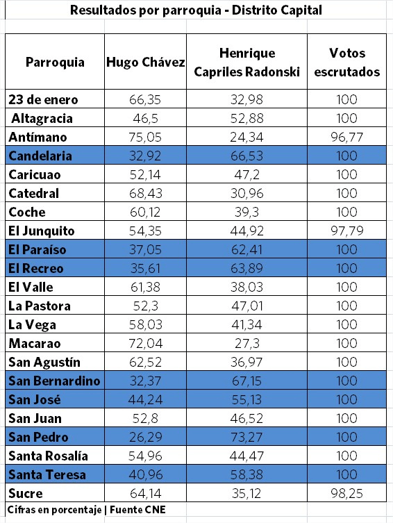 Caracas: Resultados electorales por parroquias Publicado el 8 octubre, 20129 octubre, 2012 por COLAREBO Los resultados en la elecciones Presidenciales en las parroquias caraqueñas dan el triunfo al candidato de la patria en 14 de ellas y en las 8 restantes ganó el candidato de la antipatria. Comparte esto: Haz clic para compartir en X (Se abre en una ventana nueva) X Haz clic para compartir en Facebook (Se abre en una ventana nueva) Facebook Haz clic para enviar un enlace por correo electrónico a un amigo (Se abre en una ventana nueva) Correo electrónico Haz clic para compartir en Pocket (Se abre en una ventana nueva) Pocket Haz clic para compartir en Pinterest (Se abre en una ventana nueva) Pinterest Haz clic para imprimir (Se abre en una ventana nueva) Imprimir Haz clic para compartir en Tumblr (Se abre en una ventana nueva) Tumblr Haz clic para compartir en LinkedIn (Se abre en una ventana nueva) LinkedIn Haz clic para compartir en WhatsApp (Se abre en una ventana nueva) WhatsApp Haz clic para compartir en Telegram (Se abre en una ventana nueva) Telegram Más Haz clic para compartir en Reddit (Se abre en una ventana nueva) Reddit Me gusta Cargando... Relacionado