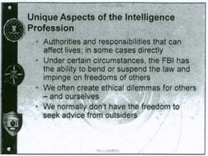 En un memorándum, comentado por Spencer Ackerman y Noah Shachtman, el 28 de marzo 2012 en la sección Danger Room de Wired, el FBI instruyó a sus agentes a «torcer o suspender la ley» mientras espían electrónicamente a sus sospechosos. Ante la controversia provocada por el temor a que el FBI pueda “torcer la ley” y violar derechos constitucionales persiguiendo a “sospechosos de terrorismo”, la oficina retiró el documento de su plan de estudios de entrenamiento en contraterrorismo. Dijo que era una instrucción “imprecisa”.