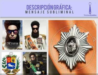 El grupo de TrincheraCreativa en su sitio de Facebook detectó lo que sin duda es un «mensajito» subliminal que Hollywood no deja de utilizar como herramienta perversa con la película gringa que se estrenó en mayo, llamada El Dictador.Resulta que el «delicado» mensaje subliminal que se puede observar sobre la banda del protagonista que en este caso es el Dictador, al acercar la imagen vemos una placa plateada con un escudo, pero no cualquier escudo, es el de nuestro país Venezuela.