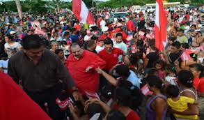 Y llega el ladrón de los votos. La emoción y jolgorio es total. Banderas, afiches, gorras, bolsas de comida con la fotografía del mesías, se confunde y se reparten. Aquello es una alucinación total. Llegando al delirio colectivo cuando el recién llegado saluda en nombre de Dios y con citas bíblicas.