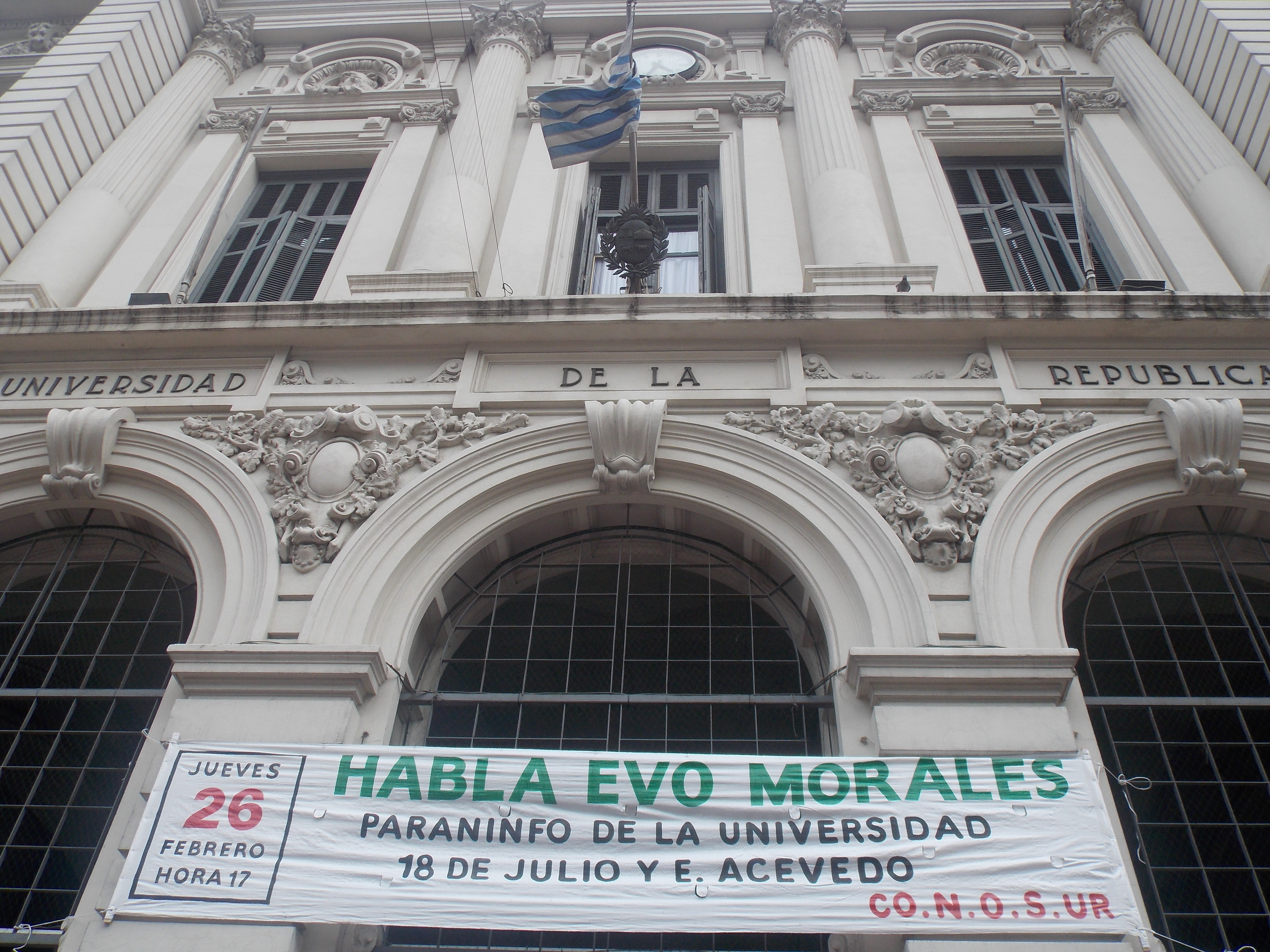 El escritor Eduardo Galeano lo saludó a través de una carta y en el acto le dijeron que Evo era una persona digna de estar sentado en el Paraninfo, en el mismo lugar que en 1961 lo había hecho el Che Guevara.