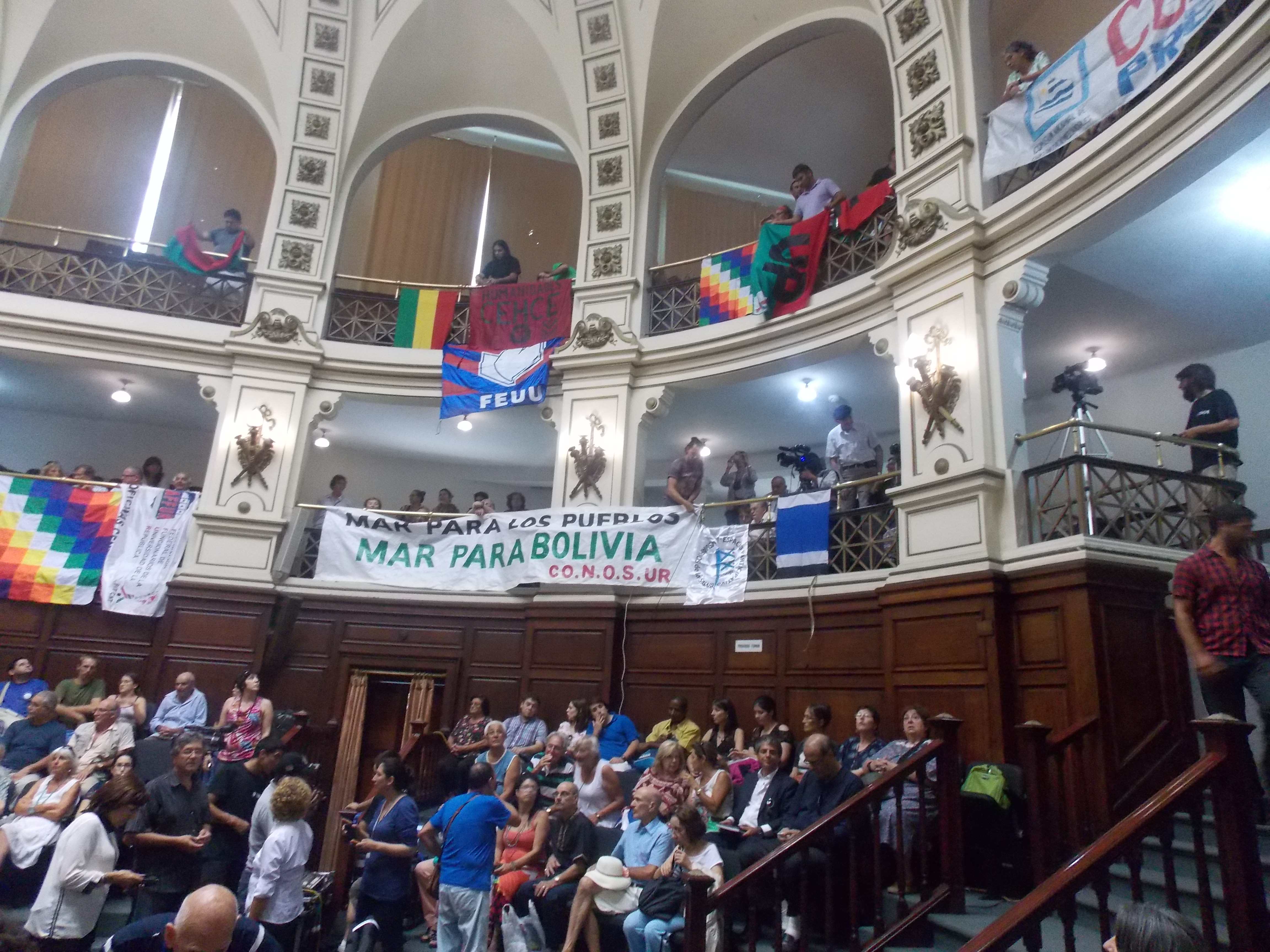 El presidente Morales tuvo ayer un cálido y efusivo recibimiento por parte de la comunidad universitaria y trabajadora de nuestro país. En primera instancia, el mandatario boliviano fue recibido por el rector de la Universidad, Roberto Markarian, así como por centenares de estudiantes, docentes y trabajadores que colmaron las instalaciones del Paraninfo de la República. El clamor entre los presentes a través de numerosos carteles era: “Mar para los pueblos, Mar para Bolivia”.