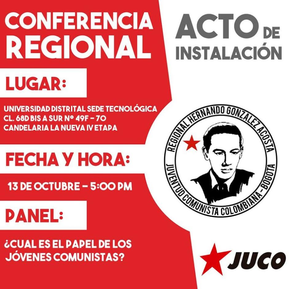 En Bogotá la dirección de la Juventud Comunista Colombiana. Comité Regional Hernando González Acosta, invita a la ciudadanía y en especial a las nuevas generaciones para que participen en el acto público de instalación de la Conferencia Regional de la organización juvenil revolucionaria que tendrá lugar el viernes 13 de octubre a partir de las 5:00 pm en la Universidad Distrital, sede tecnológica, en el barrio Candelaria La nueva, de la localidad 19 de Ciudad Bolívar.