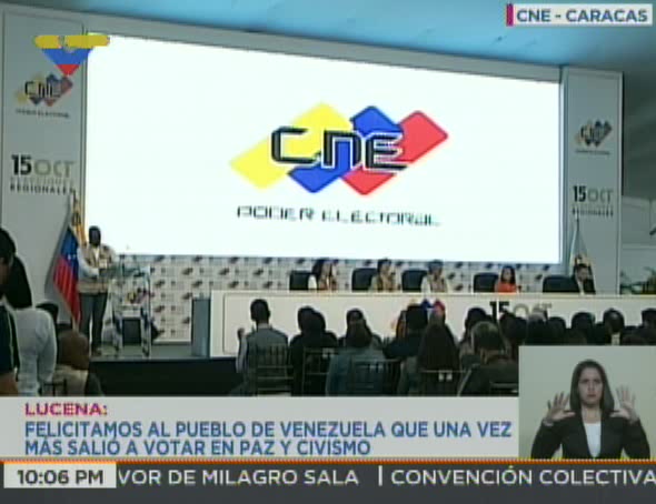 A las 10:02 pm de este 15 de octubre, la Junta Directiva del CNE en pleno, encabezada por Lucena, ofreció los resultados tras el 95,8% de transmisión que arrojaron una gran participación del 61,14% y la victoria para el Partido Socialista Unido de Venezuela (PSUV) con 17 gobernaciones, mientras la oposición obtuvo 5, cuatro para el partido Acción Democrática (AD) y una para el de Primero Justicia.
