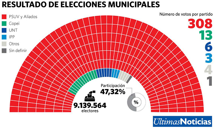 ÚN.- Este domingo 10 de diciembre se realizaron las elecciones municipales en las que participaron un total de 9.281.257 personas. Los más de nueve millones de votantes representan el 47.32 % del padrón de votantes, que supera los 19 millones, al tiempo que los resultados fueron emitidos con la transmisión de 31.800 máquinas de votación de las 32.700 que fueron habilitadas