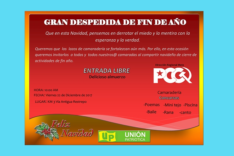 Las direcciones departamentales del Partido Comunista Colombiano PCC y la Unión Patriótica UP en el Meta convocan a la militancia y seguidores a un encuentro popular para la despedida del año 2017. El evento incluye un delicioso almuerzo y será el viernes 22 de diciembre de 2017 a partir de las 10:00 am en el Kilómetro 3 de la vía antigua a Restrepo.