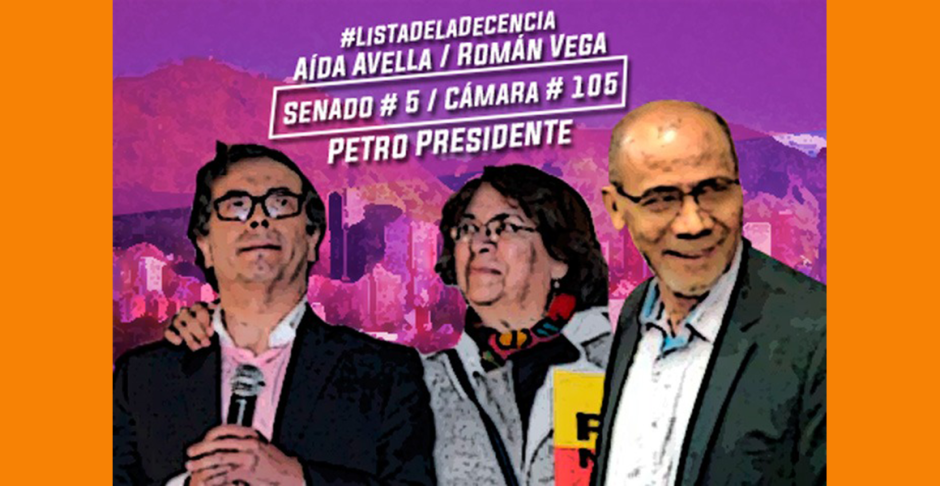 Aida Avella Esquivel, exconcejal de Bogotá y dirigente del partido Unión Patriótica, con el número 5 en la lista al Senado y el Dr. Román Vega, exsecretario de salud de Bogotá con el número 105, van por el triunfo en las elecciones del domingo 11 de marzo con el respaldo de la ciudadanía y organizaciones sociales y comunitarias del Distrito Capital.