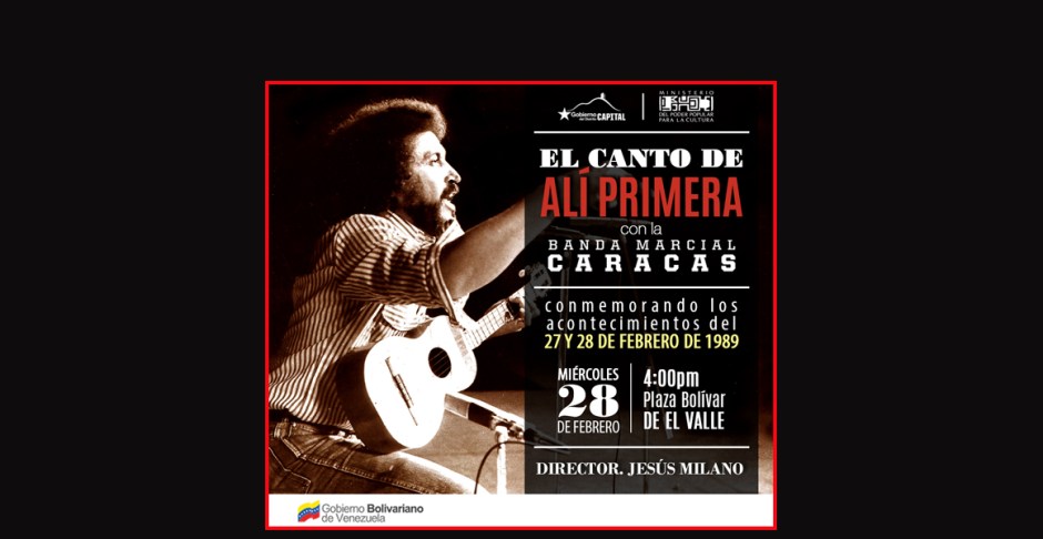 Dicha actividad se desarrollará en la Plaza Bolívar de la Parroquia el Valle, a partir de las 4 de la tarde, donde la primera institución musical del país interpretará repertorio del cantor del pueblo Alí Primera, en las voces jóvenes de los intérpretes Génesis Figueroa, Oriana Ramos, Ángel Alí Cortesía, Mishell Peinate y la voz de Sergio Tachón.