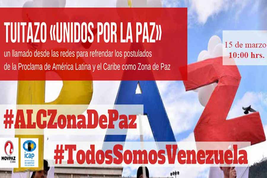 En ese sentido, invitaron a los internautas a unirse al tuitazo ‘Unidos por la paz’, el cual acompañarán con los debates de un panel de expertos sobre temas internacionales como las bases militares extranjeras, América Latina y el Caribe como Zona de Paz, la carrera armamentista, el desarme nuclear y las amenazas de Estados Unidos contra Venezuela y Cuba.