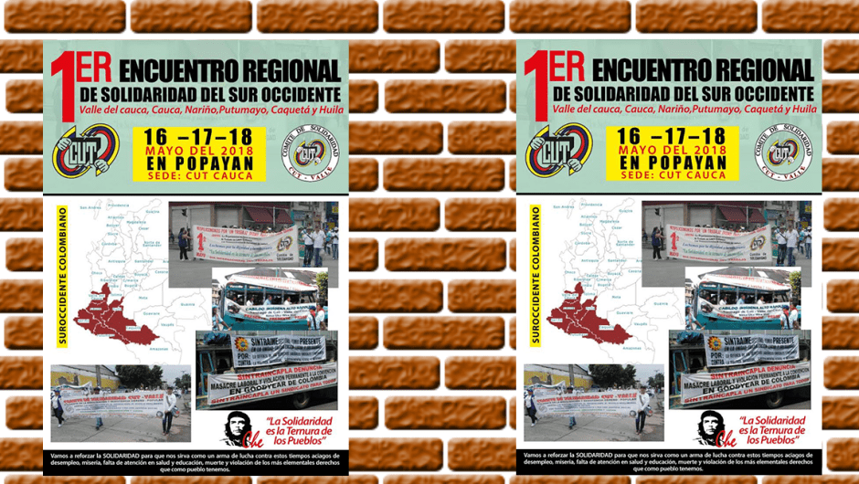 Las subdirectivas CUT Cauca, Nariño, Putumayo, Caquetá, Huila y Organizaciones filiales en esta sección del territorio nacional han sido convocadas para la realización del Primer Encuentro Regional de Solidaridad del Suroccidente los días 16, 17 y 18 de mayo de 2018 en la ciudad de Popayán, Cauca.
